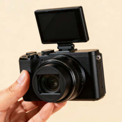 - Design: A compact digital camera with a black body, weighing only 220 grams; a 3-inch flip touchscreen; a 10x optical zoom lens, and a stylish appearance.